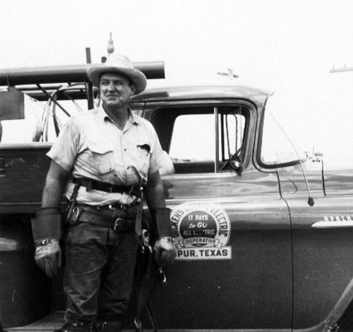 Electrification finally made it to Bub’s parents’ farmhouse when he was in the 7th grade. “I remember them drilling the holes for the poles. We’d go out and watch.” Work there was completed by the Dickens Electric Cooperative.[9]Dickens Electric Cooperative (DEC) merged with the South Plains Electric Cooperative (SPEC) in in 1999. Click here for a colorful history of DEC and SPEC. With a little imagination, could it be possible that the lineman below, was among the crew Bub and his friends watched? ‘Seen by the unseen’ doesn’t always have to be creepy. (Note to self: See if you can identify this gentleman.)