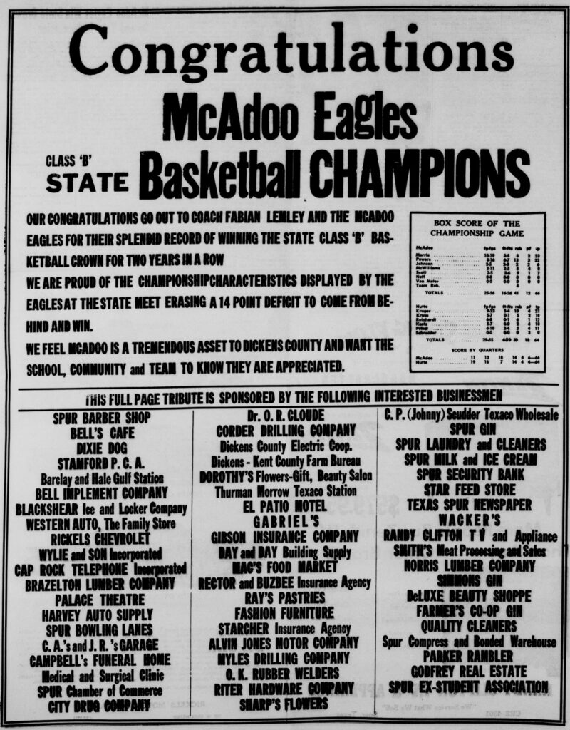 The McAdoo Eagles won Texas state championships in 1960 (d. Henrietta Midway, 58-42), ’63 (d. Nocona Prairie Valley, 53-35) and ’64 (d. Hutto in a nail-biter, 66-65).